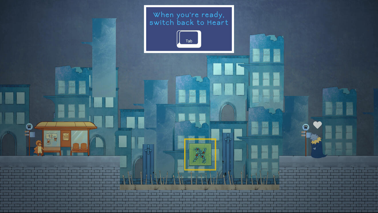 Heart and Mind is a puzzle platformer made with Jerry Chen, Sophia He, Mauricio Luzardo, Jamari Miller, Amber Qu, Jada Rozier-Williams, and Tiffany Yu. The game follows a personofication of an old woman's heart and mind as they try to find Mind's lost crown.I served as one of the lead programmers and level designers in the project, but also led narrative discussions, helped out with producing when necessary, and contributed to other areas of design.
